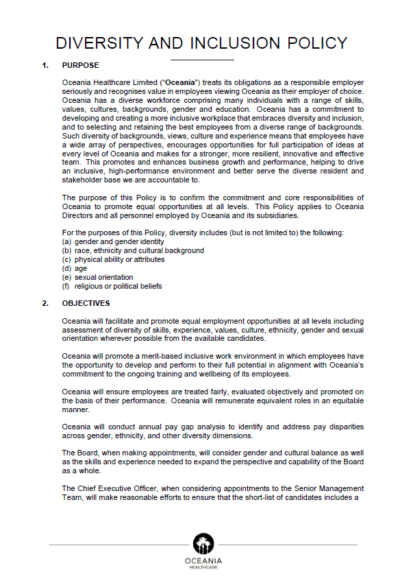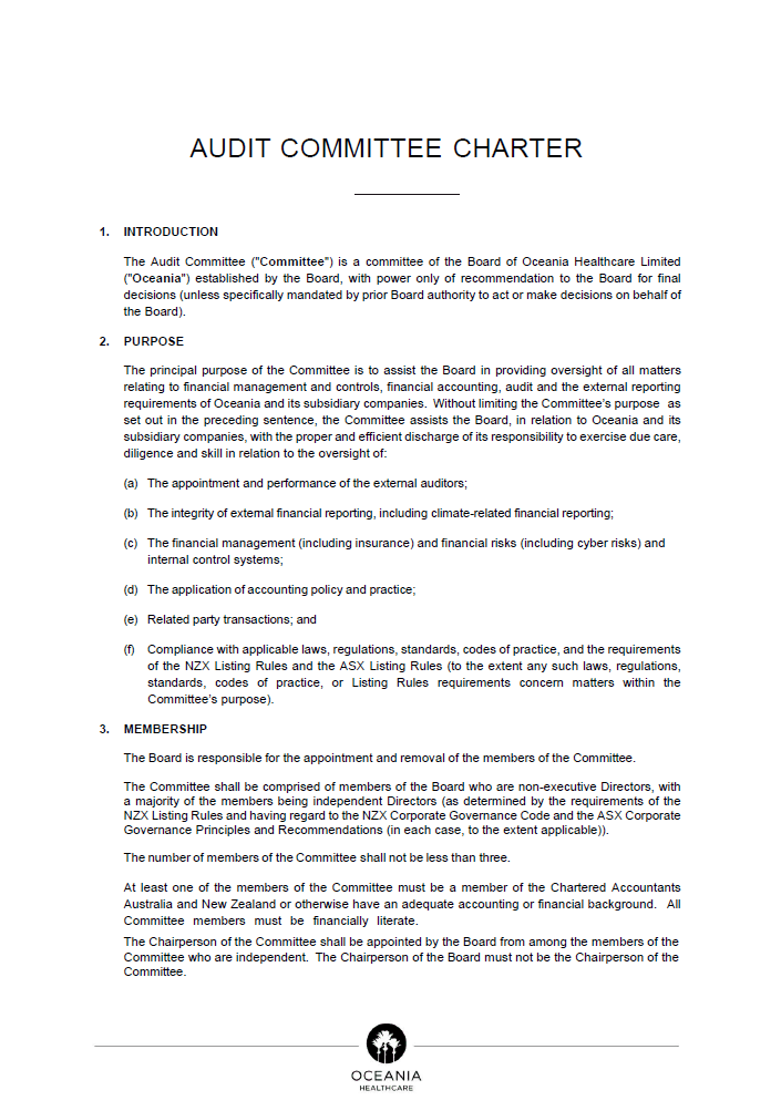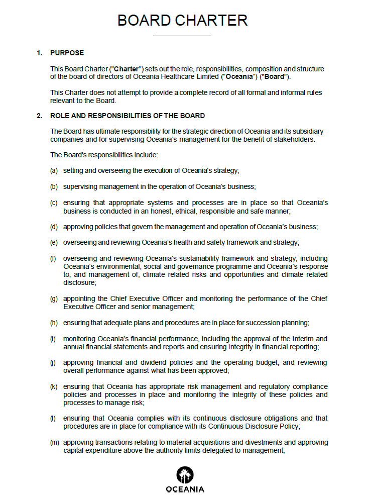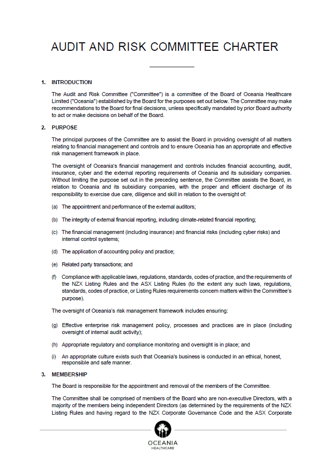 Oceania Healthcare is committed to maintaining the highest standards of governance by implementing best practice structures and policies to promote investor confidence.