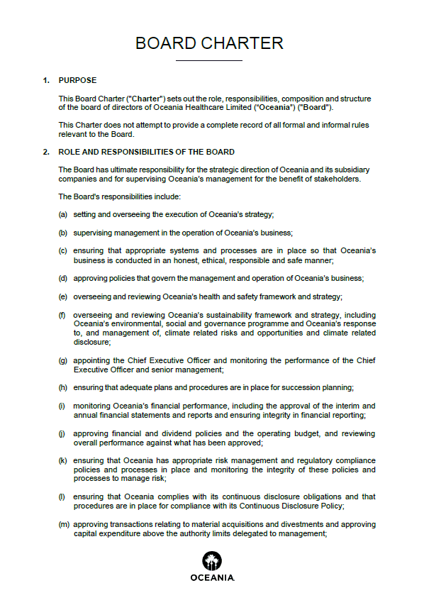 Oceania Healthcare is committed to maintaining the highest standards of governance by implementing best practice structures and policies to promote investor confidence.
